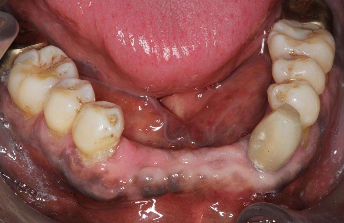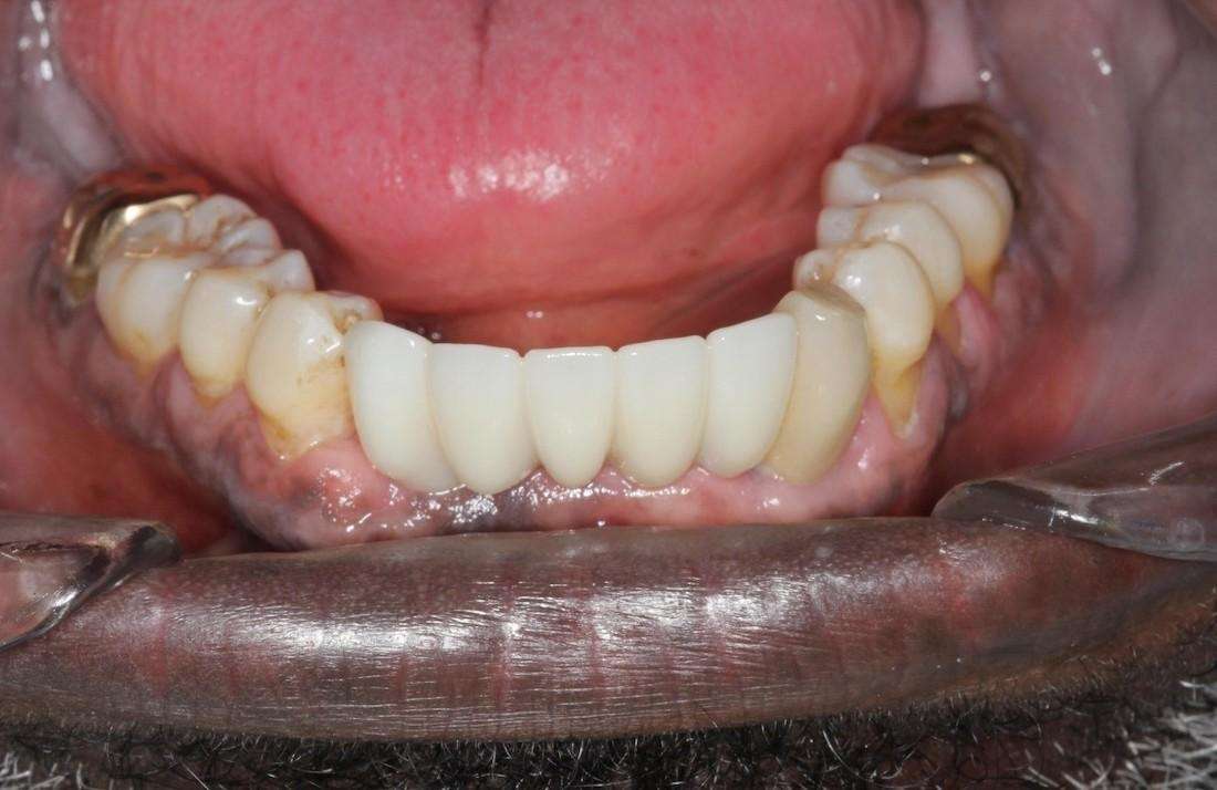 Severe gum disease caused multiple teeth to fail and severe bone infection in the patient. Once overall health was addressed, the patient chose to undergo bone grafting to rebuild lost bone and implant placement to maintain the remaining bone structure and restore missing teeth. This treatment provided proper lip support and restored proper speech.