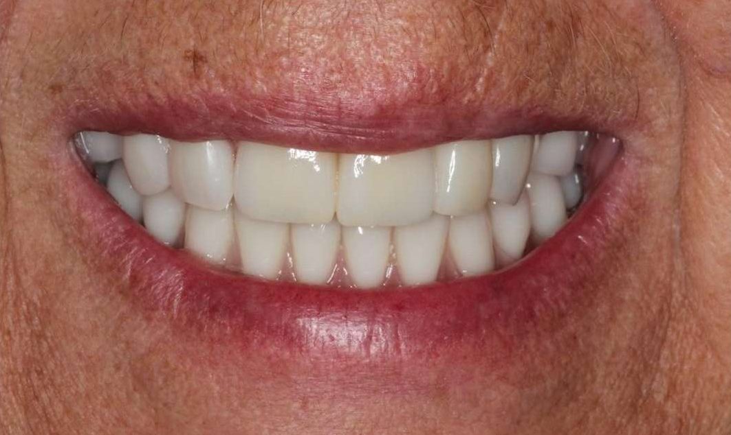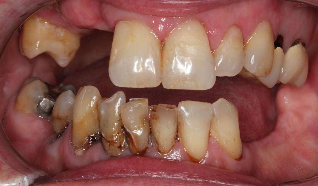 This patient presented with severe tooth decay, causing a degradation of multiple teeth. Once overall health was addressed, a combination of removable appliance therapy and crown treatment was completed to give the patient a new smile, a new bite, speech preservation, and facial support.